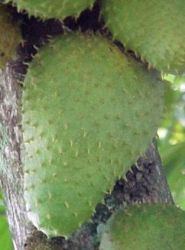 La guanábana tiene un fruto de forma oval o de corazón compuesto de numerosos pistilos. Los frutos maduros miden unos 30 centímetros de largo por 15 centímetros de grueso. Están rodeados por una cáscara de color verde amarillento, coriácea, rodeada por numerosas espinas suaves.