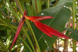Las heliconias son plantas monocotiledóneas, herbáceas, perennes y rizomatosas pertenecientes al género Heliconia de la familia de las Musáceas. Existen alrededor de 250 especies de heliconias, todas ellas nativas de las regiones tropicales de América y las Islas del Pacífico sumamente apreciadas por su valor ornamental. Localmente reciben el nombre de platanillos.El tamaño de las hojas de las heliconias varía desde 15 hasta 300 centímetros de longitud. Las hojas son simples, sin pecíolo, oblongas y opuestas una junto a la otra.