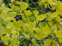 Las flores de color amarillo brillante nacen agrupadas en racimos colgantes de 20 a 40 centímetros de largo. Cada flor de 4 a 7 centímetros de diámetro está formada por 5 pétalos.
