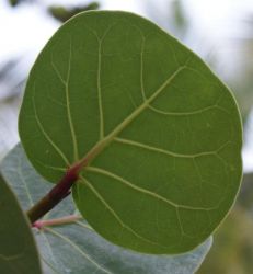 Arbol pequeño o arbusto hasta de 8 m de altura, a veces postrado, perennifolio, inerme, con exudado rojizo, dioico. Tronco generalmente torcido, Copa redondeada con ramas gruesas y toscas las cuales frecuentemente surgen de la base del tronco. Hojas alternas, simples, tiesas y coriáceas, con venación rojiza, redondeadas o reniformes, de 7 a 14 cm de largo, por 12 a 20 cm de ancho, acorazonadas en la base, con el margen entero y ligeramente curvo.