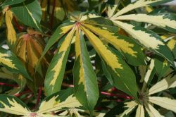 La yuca es un árbol pequeño hasta de 5 metros de altura provisto de grandes rizomas tuberosos. Las hojas son palmadas, alternas, compuestas de 3 a 7 lóbulos espatulados a linear-lanceolados , acuminados, de 7 a 15 centímetros de largo, con el margen entero, verdes, glabros, la variedad variegata tiene las hojas verdes manchadas de amarillo y largos pecíolos de color rojo. Flores en panículas de 1 a 1.5 centímetros de largo. Frutos capsulares, globosos, redondos u oblongos, de 1 centímetro de largo, con seis ángulos alados y tres semillas carunculadas por cápsula.